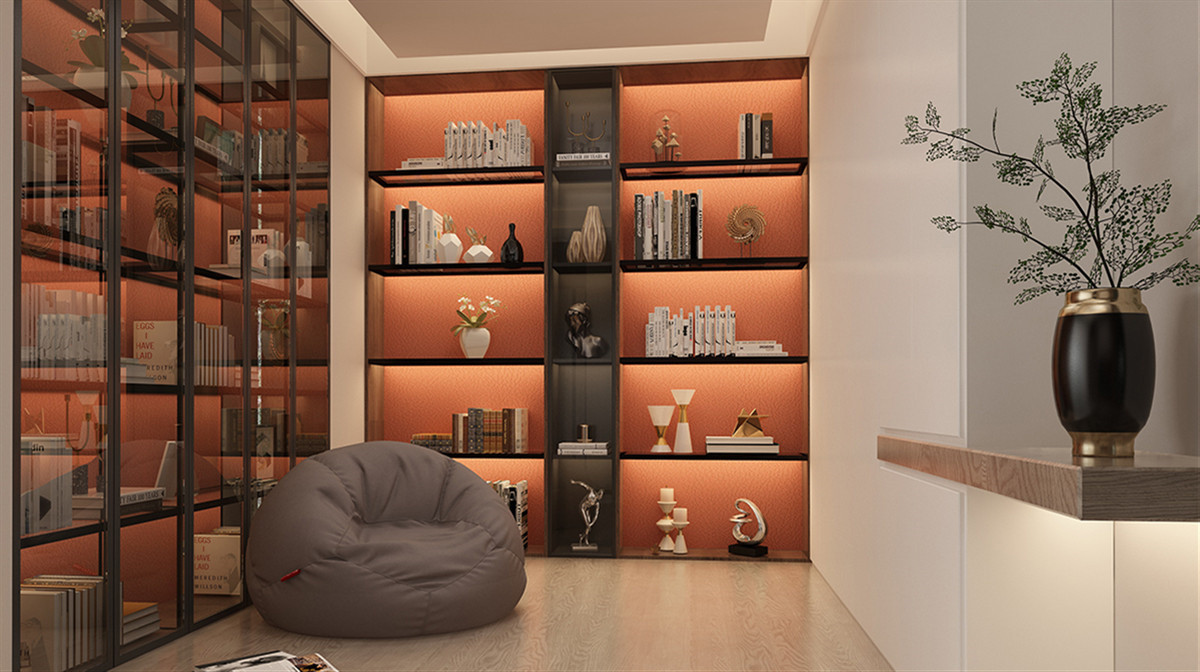 The large-scale use of light-colored tones creates a clean, bright, elegant and atmospheric mood in the living room space. The addition of orange, while expanding the visual effect, gives the space a low-key, luxurious light and luxurious temperament.