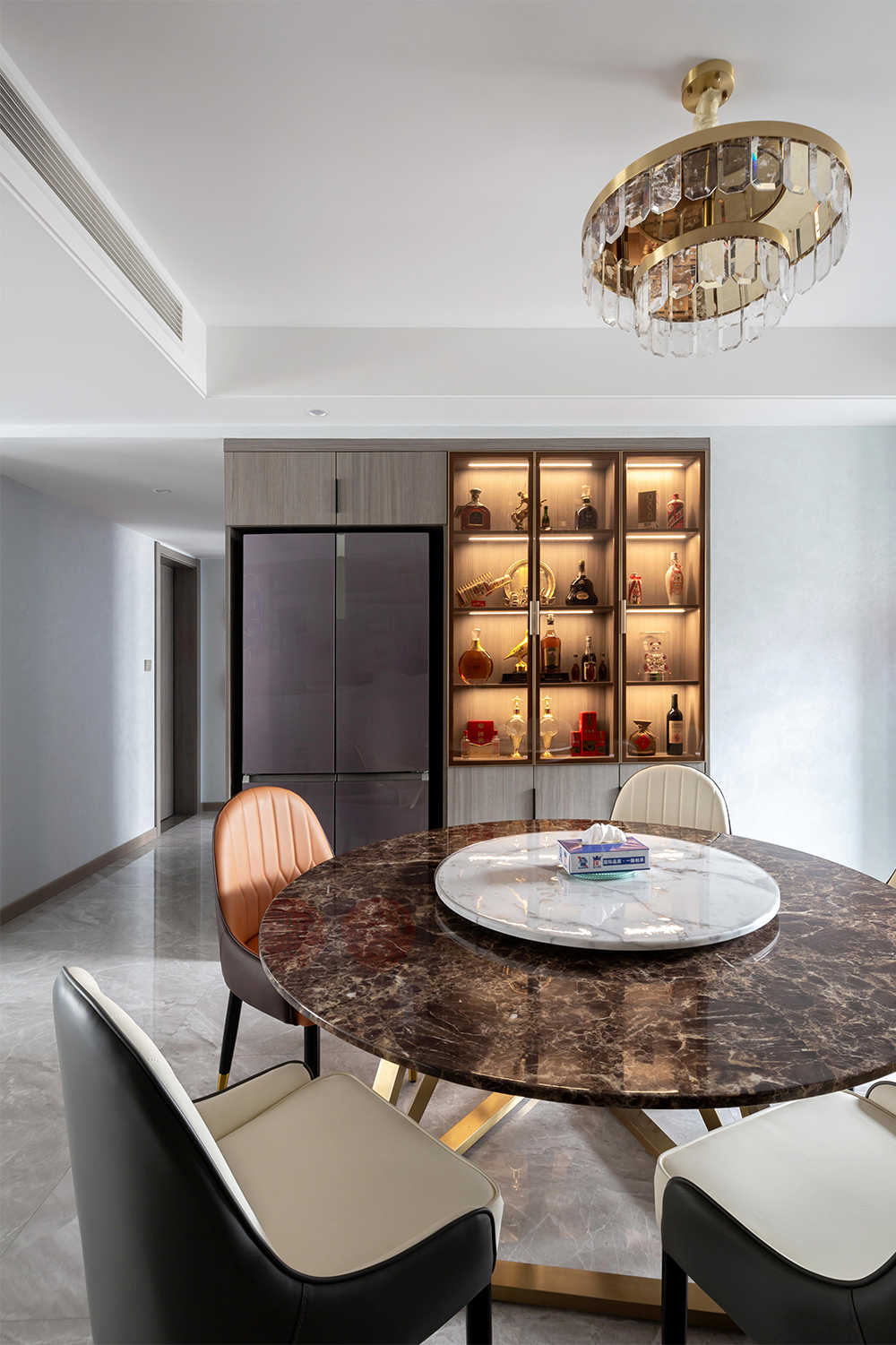廊道右侧便是餐厅所在区域,地板与餐桌表面都采用大理石纹路的砖面,显得典雅又轻奢。后方做了一整面的酒柜与墙面相连。左侧在酒柜旁做了冰箱柜,嵌入式冰箱放置节省了占地空间,整面式的做法有一种舒适的视觉感。
