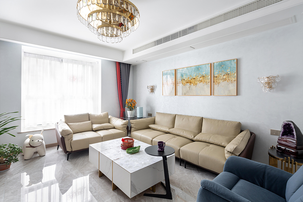从客厅处映入眼帘的便是郁郁葱葱的绿植,体现出屋主对于生活认真的态度。客厅的墙面板采用白色大理石纹路,墙面的装饰画给整个空间增添了美感。