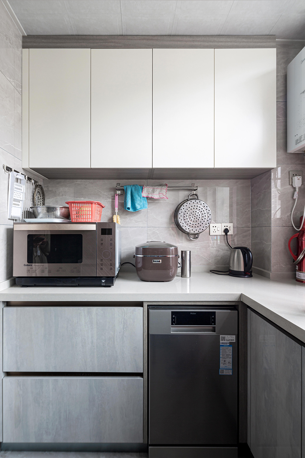 厨房在风格上延续了现代简约的风格,采用U 形的厨房布局设计,在台面下方做了一个与阳台洗衣机柜相同的柜体。左侧做了厨具收纳,右侧放置家电,在布局上不仅美观,而且同时具备了收纳的功能。