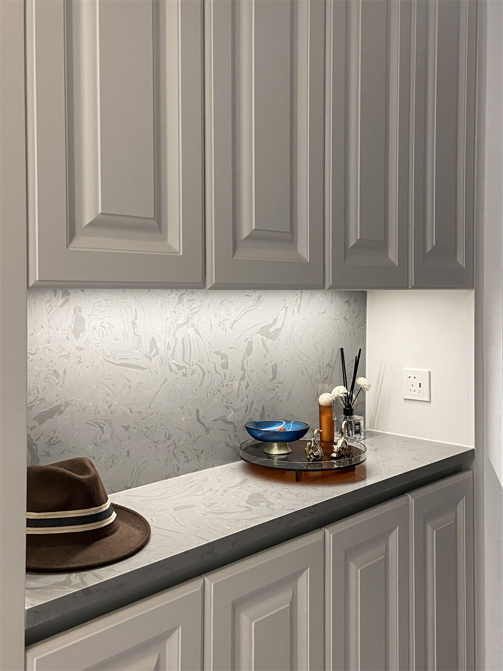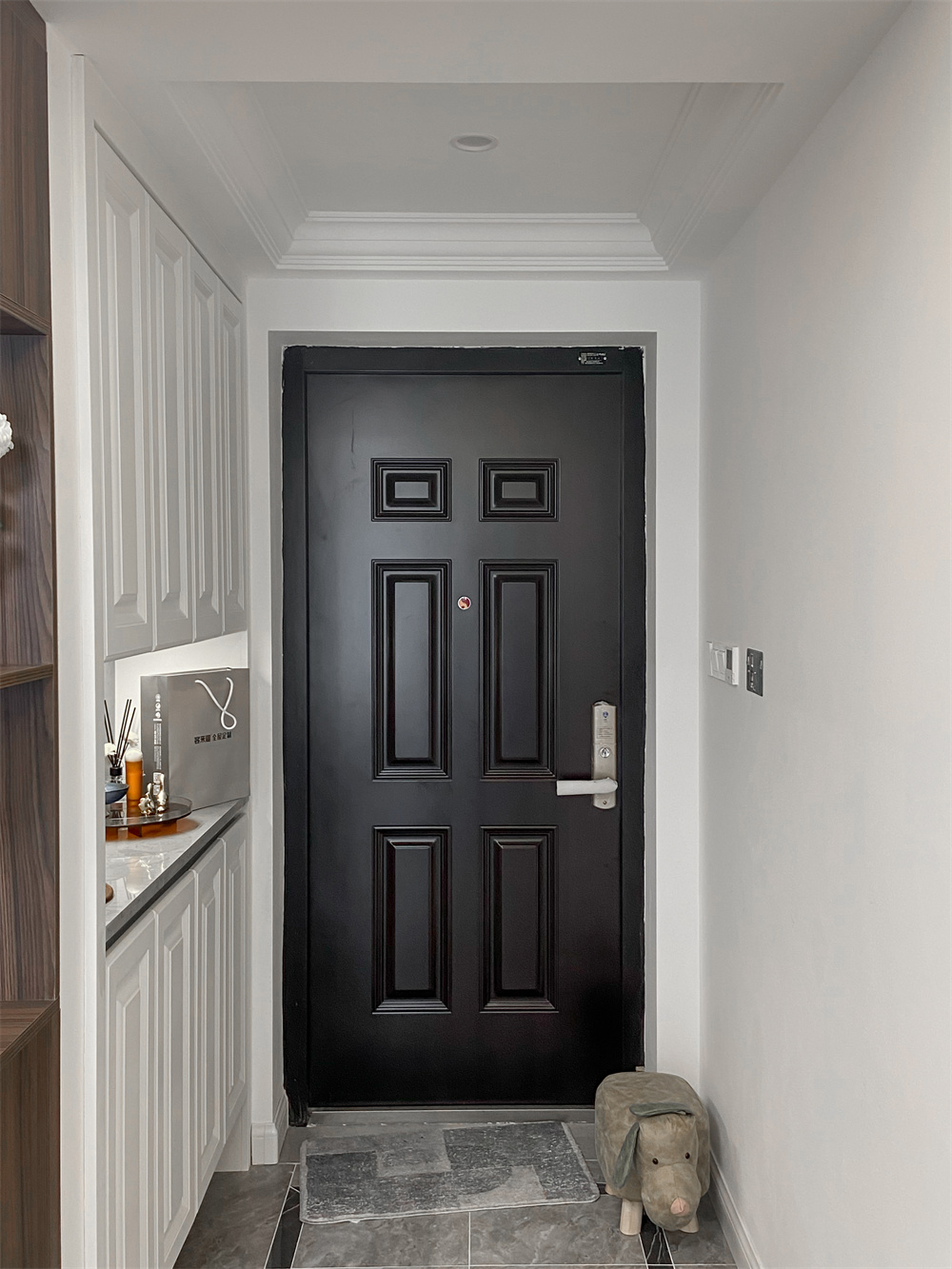 定制的整面到顶的玄关柜,芬兰白的颜色颇为典雅,中部的空余部分可以放置钥匙包等生活物品,在到顶鞋柜的底部同样留出一排空间,放一些常换的拖鞋,扫地机器人也能进去清扫,卫生无死角。玄关的柜子都做了无拉手设计,相对比较整洁。摆放一些精致的小饰物,体现出屋主优雅的品味。