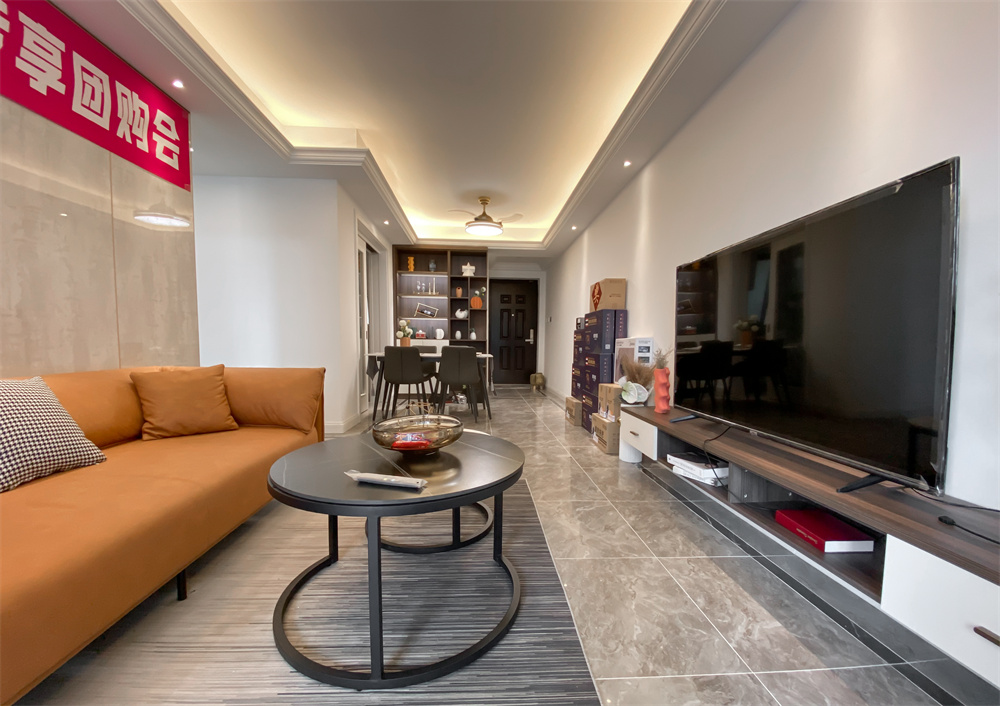 客厅的整体颜色呈中性暖色调,即便是简单的装修中也能透露出家的温暖。因为客厅的整体氛围偏向于安静沉稳,所以精心选择的橙色沙发,于色彩上增加跳脱感,造型简洁,线条流畅的家具组合搭配,营造出稳定、协调、温馨的空间感受,满足现代年轻家庭的轻奢需求。