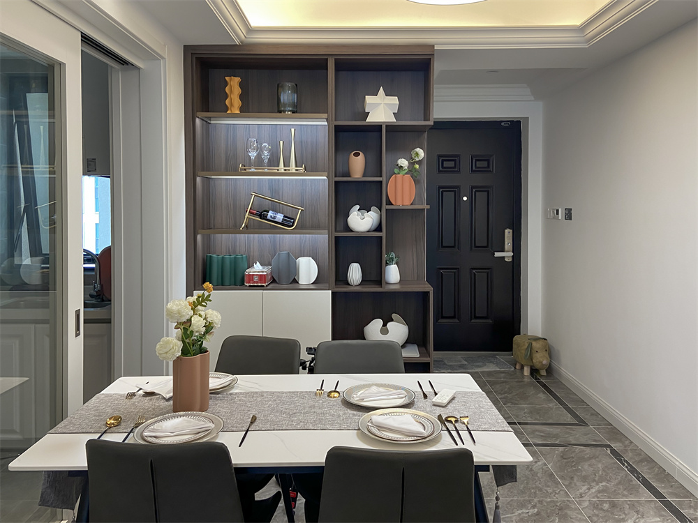 整排的餐边柜收纳柜,让功能性大大加强,平常的餐具、藏酒都可以妥妥的安排下,开放的柜子作为展示,也可以放置一些常看的书和装饰摆件。餐桌上摆放花束让吃饭多了一丝温馨,餐边柜的不规则设计柜层,不仅满足不同高度物品收纳的需要,使整体更加具有层次感。