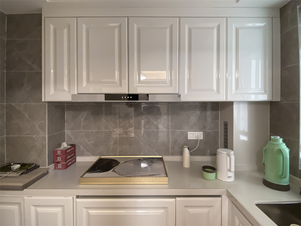 厨房是L型的橱柜布局,切菜区、台盆区、烹饪区形成一条动线,让烹饪不再手忙脚乱。芬兰白膜压橱柜门板,如奶油般的质感更加细腻自然。吊柜应当与台面保持距离,避免因为距离过近影响使用效果。
