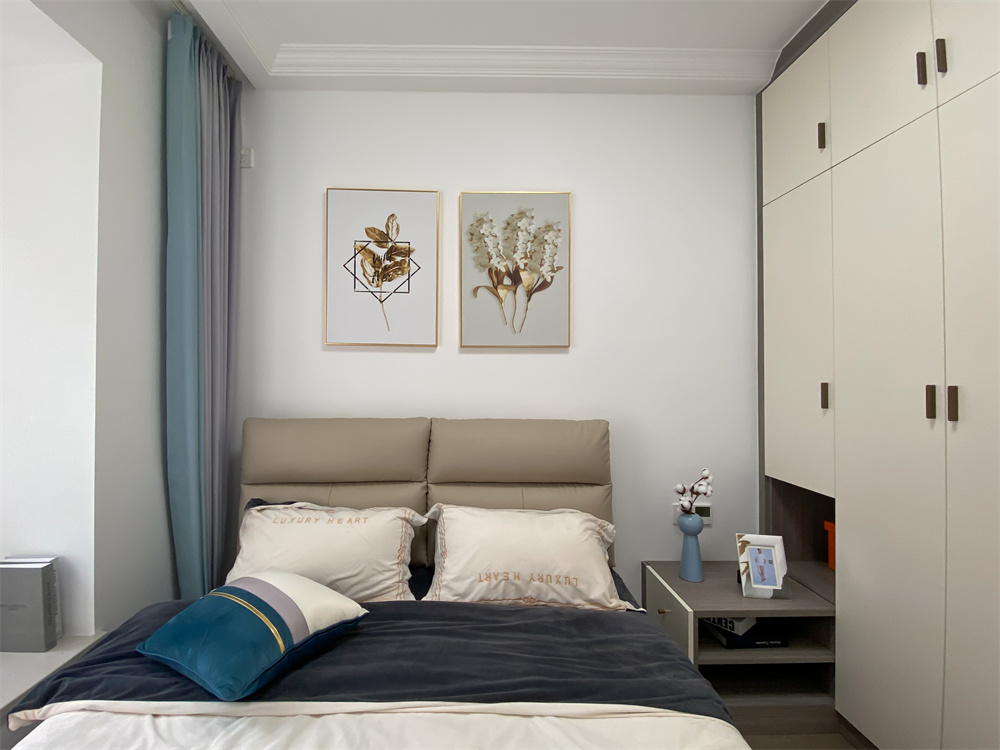 白色床单和灰色床头的颜色搭配,整体更加轻松简洁。芬兰白整面衣柜为衣物收纳提供好住处,侧面板可以打开内置长方形小镜子,梳妆完成后可以通过镜子看一看今天的气色,感受不一般的心情。