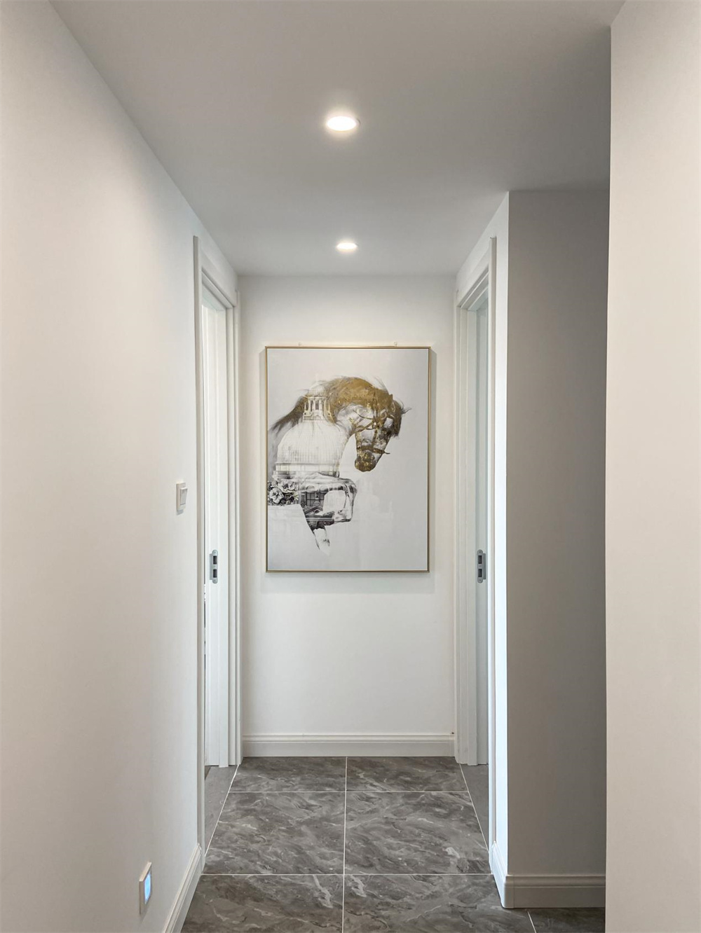 对于走廊空间较小的房屋,建议在走廊两侧放置一些精美的挂画,可以根据自己的喜好选择,白色的墙面略显的有些空荡,这样可以增加空间内的丰富感。