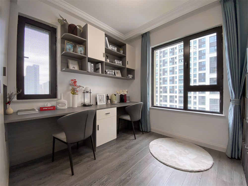 先是整面的柜子,然后与柜体相连接的书桌。吊柜采用灰橡木纹加芬兰白的颜色搭配,从板材中透露出时光的内涵。书桌的长度两个人一起办公、听音乐、品茶都是不错的选择,在工作之余放松自己也不失为一种享受。
