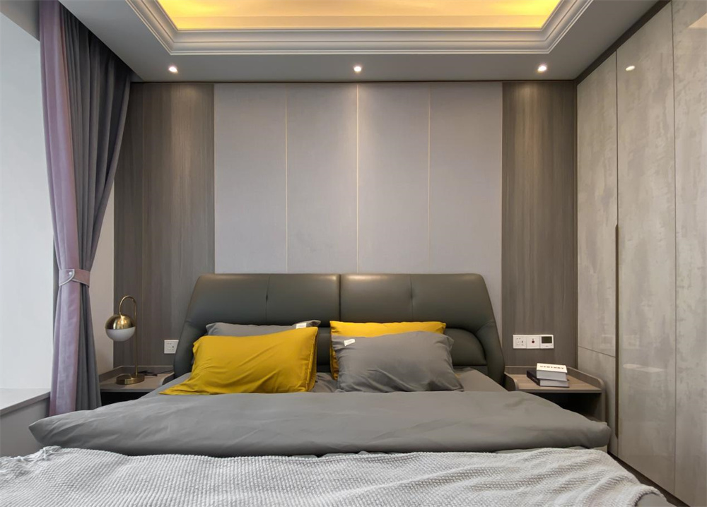 主卧整体延续轻奢的风格,以黑白灰衬底。背景板用的是灰白两色护墙板,呈现简约干练的特质。墙面未着任何的点缀,却也不显得空旷突兀。以灰色为主调的舒适床品,加以穿插其间的黄色调,在床头射灯的氛围烘托下,时尚又不失温馨感。