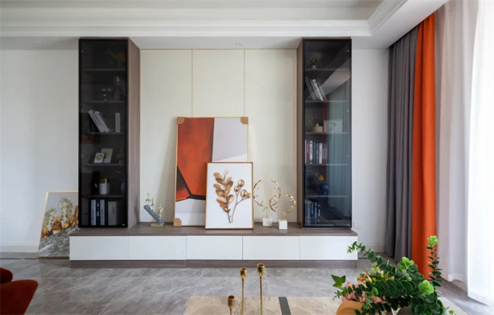 因为电视机未到所有在电视柜上方摆上挂画以装饰。电视柜上方两侧对称分布着书柜,日常放放书和奖杯奖状。考虑到电视柜长度和宽度的问题,如果只放电视机会有些空荡,书柜的打造提供收纳功能,也让整体更加饱满。