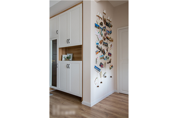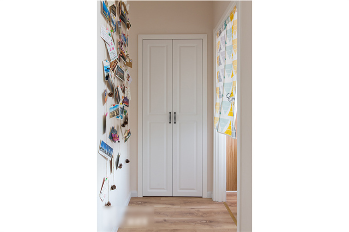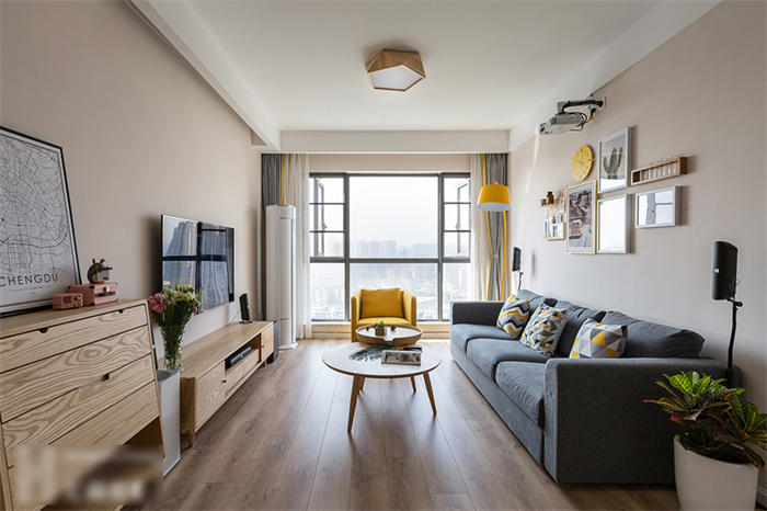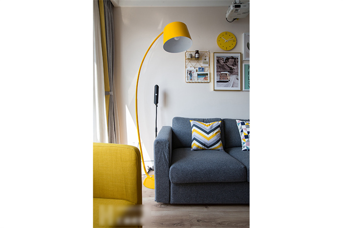 进入客厅,首先映入眼帘是简约的白色立柜和一组照片墙的设计。每一张照片仿佛都在述说一个故事,记录这个95后小夫妻每个难忘的瞬间。米兰定制的芬兰白入户柜和木门在照片墙的陪衬下温馨感十足。撞色的沙发,简洁明快的亮黄色搭配深灰色立体感拉满,驼色墙面上的艺术画交错搭配,透露着一丝文艺气息。