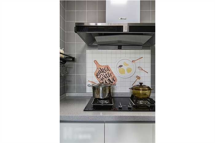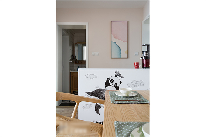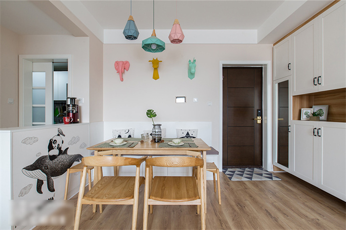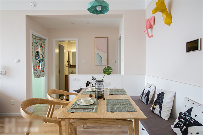 餐厅除了满足正常用餐的需求之外,还增加了收纳功能。为此米兰在餐厅处专门定制了一排绕墙的沙发柜,这样家里就算多几个人来就餐,也不会显得拥挤。原木色的餐桌与马卡龙色系的吊灯平衡出北欧精致。餐厅墙面上,三种动物的挂件与同色系吊灯在鲜明的颜色中演绎着北欧风情。
