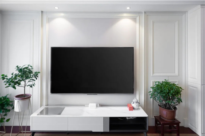 客厅整体由电视背景墙、茶几和沙发组成,绿植和花瓶的摆放让客厅空间熠熠生辉。电视背景墙以电视柜为中轴线,两侧打造对称的石膏线门板的设计,将背景墙连成完整的一面,与右侧的餐边柜花纹样式相一致,在视觉上形成连贯的效果。电视柜采用的是成品家居,黑白灰三色的搭配简约却不失格调。顶部射灯的光线向下投放,如伞状。