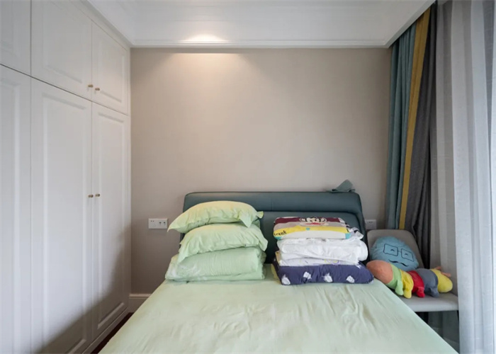 次卧与阳台相连接,使得整体的光线更加透亮,实现了在早晨起来便能感受到来自外界的第一缕光亮。与主卧处颜色搭配相反,床铺使用的是相应的淡绿色,背景墙采用的是棕色。