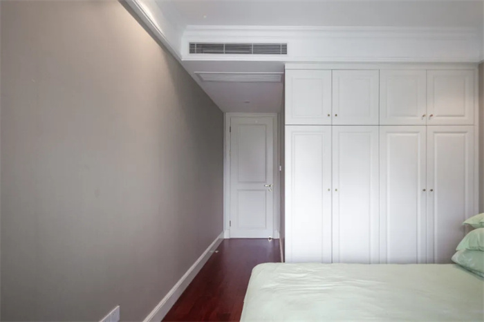 一侧整面到顶的衣柜,两开门的衣柜设计,精美的膜压门板花纹,给空间增添一丝层次感。金色的立体把手减少了拉开门时的阻力。在打造的时候要注意衣柜与床铺之间的距离,避免拉开的时候与床边相碰撞。