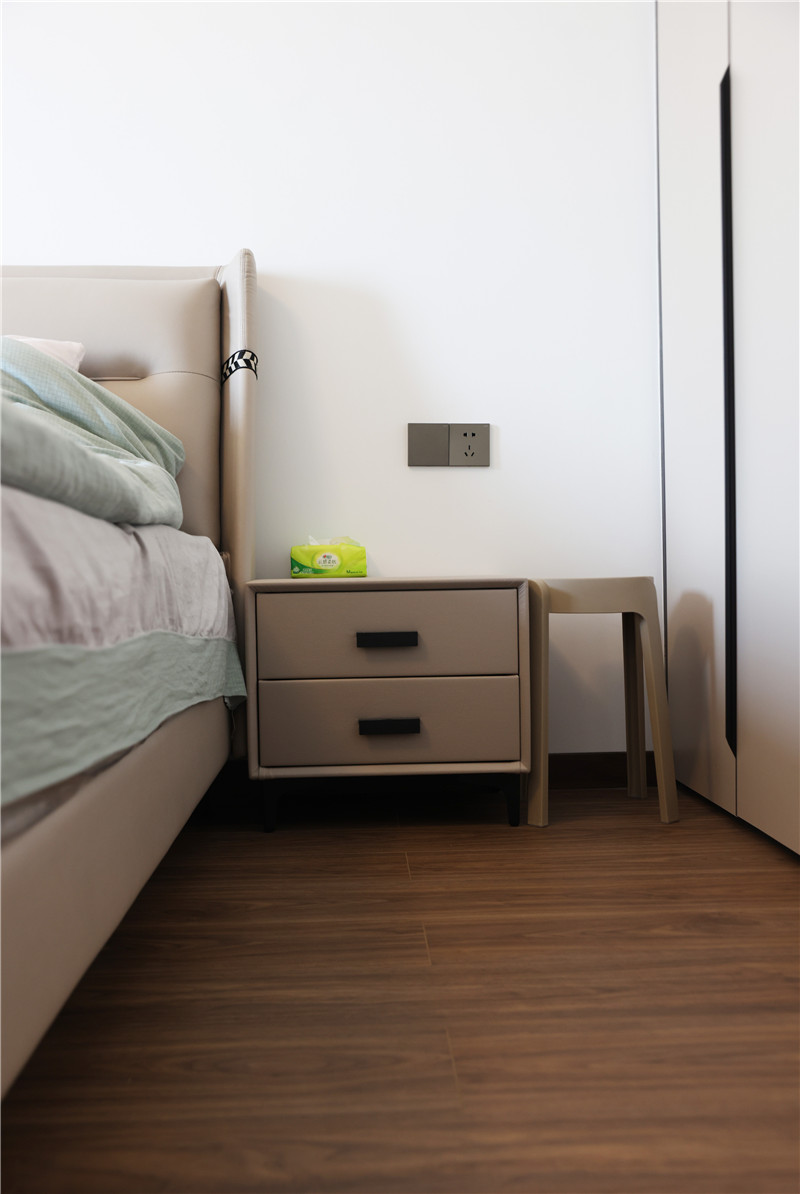 该卧室选用同种材质做柜体,窗户下打一组地柜增加收纳功能,上方铺上毛毯,略显精致。
