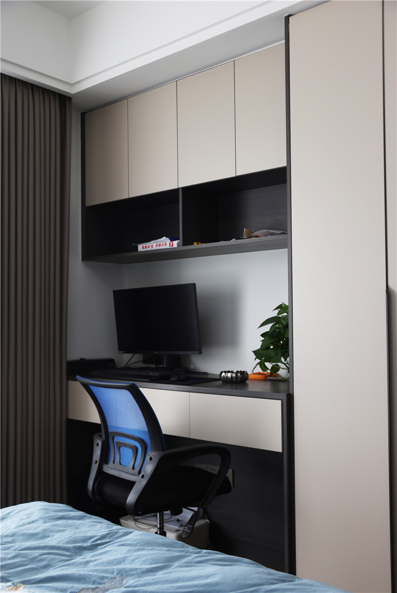 靠窗作书桌与收纳柜,与衣柜选用同种材质,整体和谐统一。开放格设计不仅可以充当装饰柜与收纳柜,还可以让空间在视觉上更开阔。