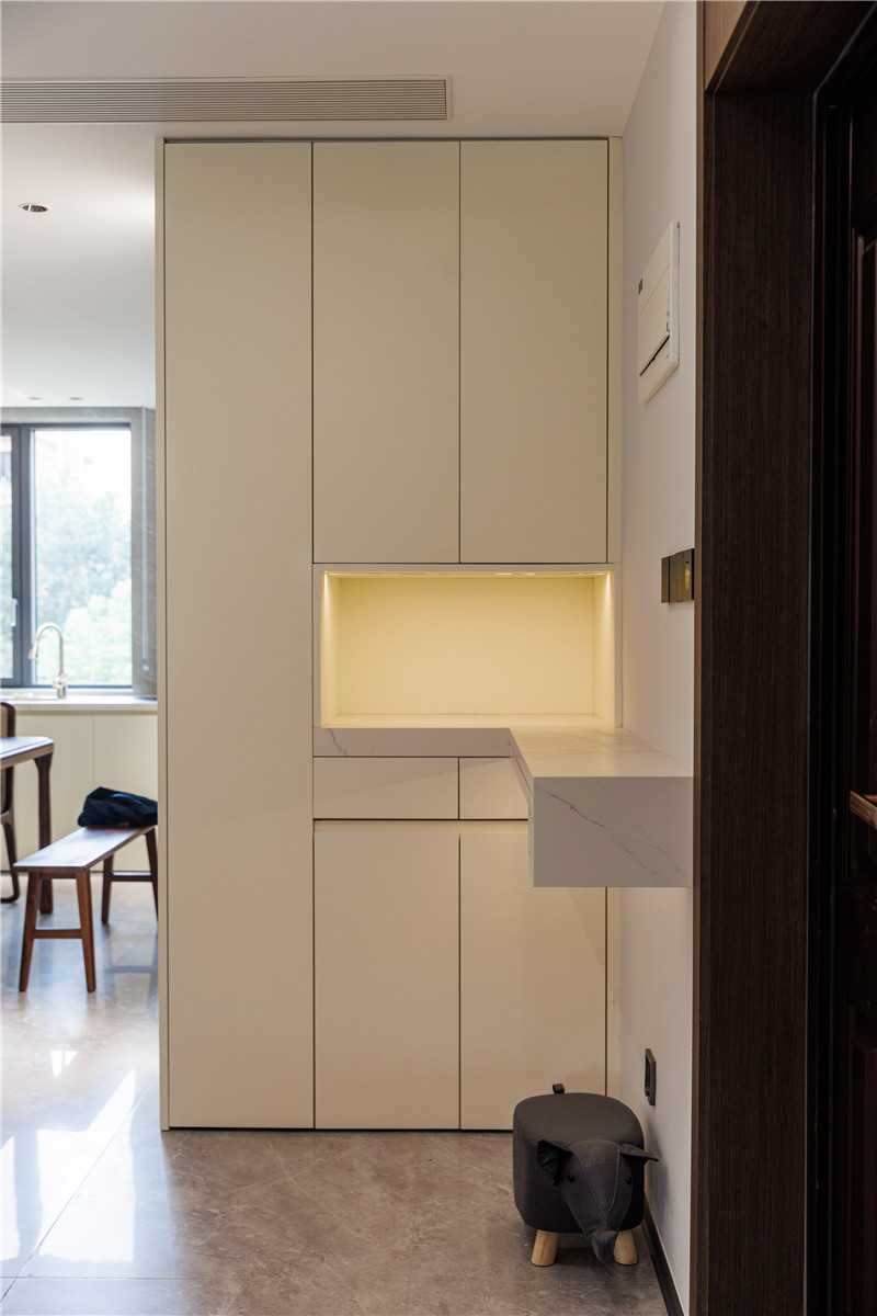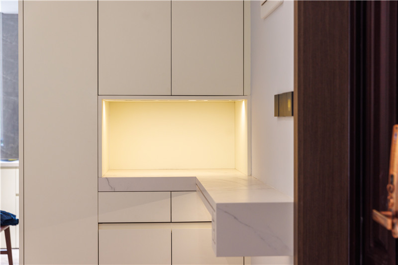 在玄关为了提升空间利用率,米兰采用了嵌入式的柜体进行上下分区收纳。中部掏空后延伸大理石台面作为置物台,放置一些小物品都很实用。