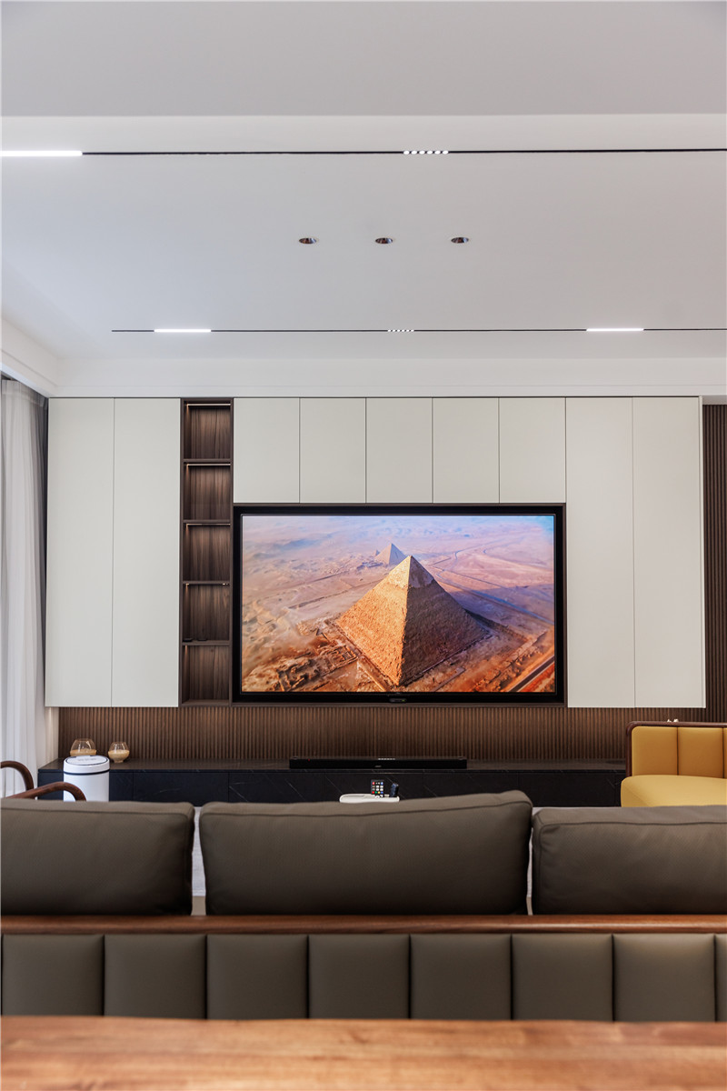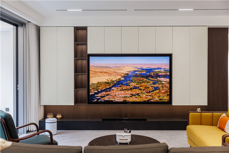围合式的空间布局里,电视柜成为环境的主角,以纳科榆木打底,再以芬兰白柜体进行生活收纳。