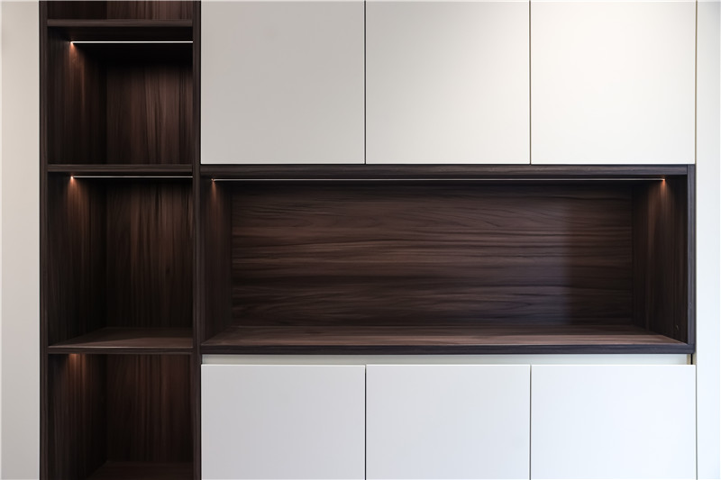听风吟,赏叶落。靠近的阳台的空间里米兰将其设计为一个开放休闲区,无论是想在这里办公阅读还是做手工、喝茶都是不错的选择。榆木柜体的纹理清晰可见,搭配纯净的白色通顶柜,带来一丝禅意,令人松弛神往。
