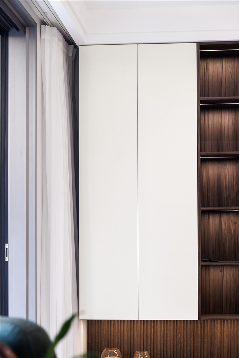 餐边柜收起生活的繁杂,还原高端定制的有序与雅致。设计师延伸柜体转角后在地柜上留了一个西厨的操作台,中西厨结合,包容每一位家人的饮食习惯,让用餐与烹饪自成一体,倾情享受他们的“食光”。