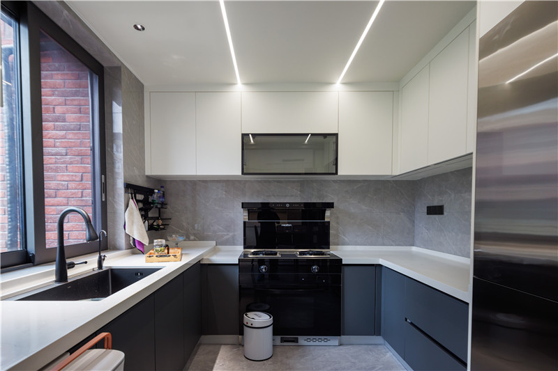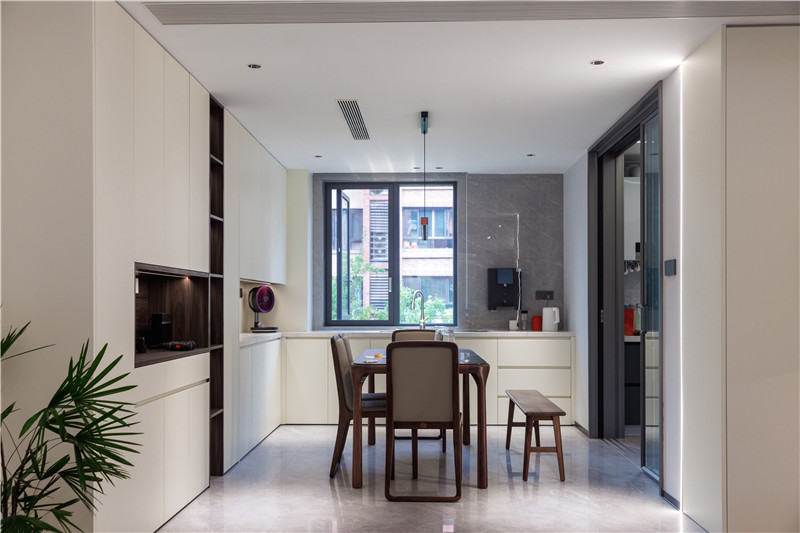 餐厨空间的设计风格与起居空间保持一致,除了传统的U型封闭式中厨外,在用餐区还做了高定全屋围合的设计。