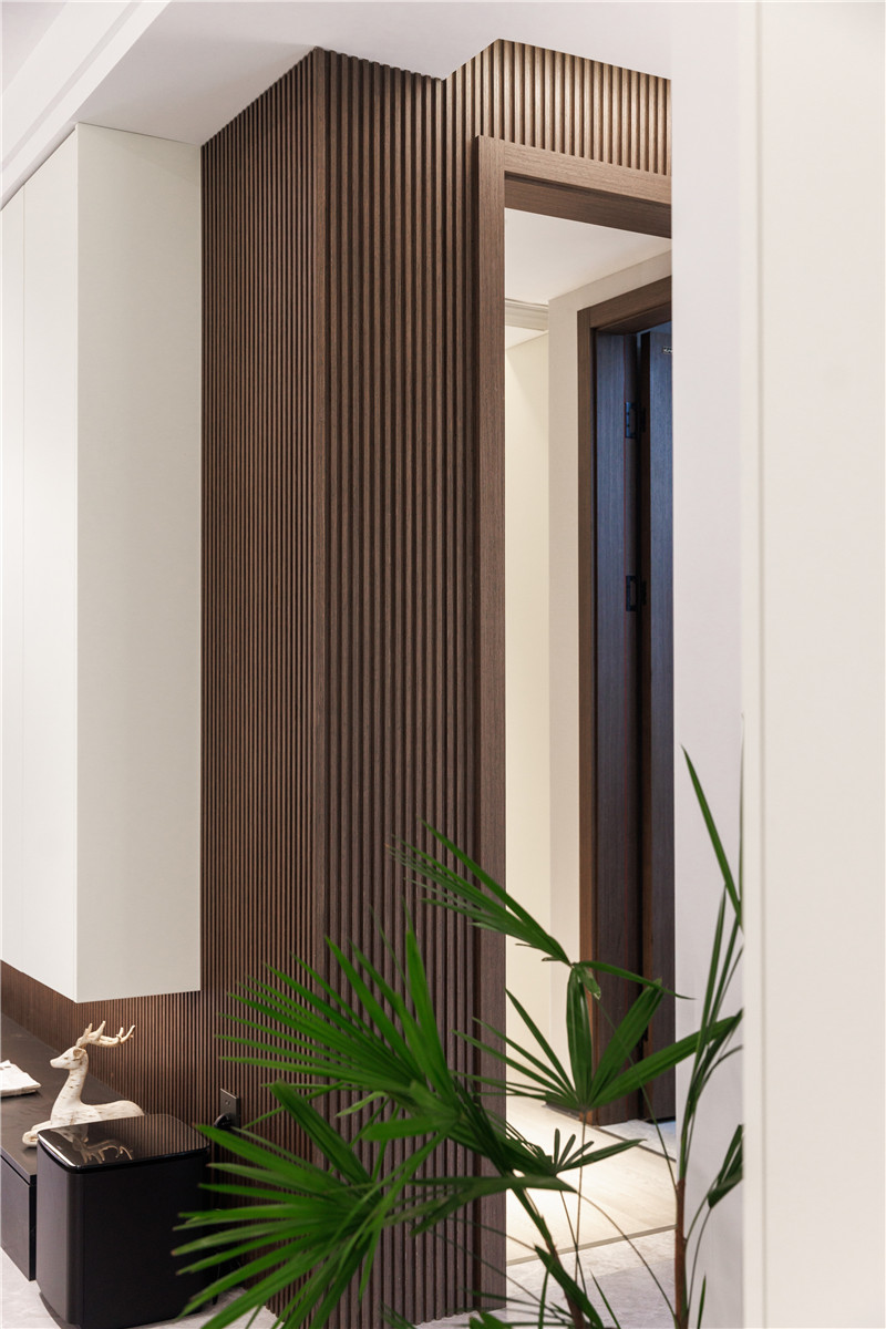 主卧空间延续一贯简约的设计手法,注重提升家居质感,强调人文的居住感受。自客厅格栅背景墙延伸至卧室空间,做成一体化的门套门框及门扇。