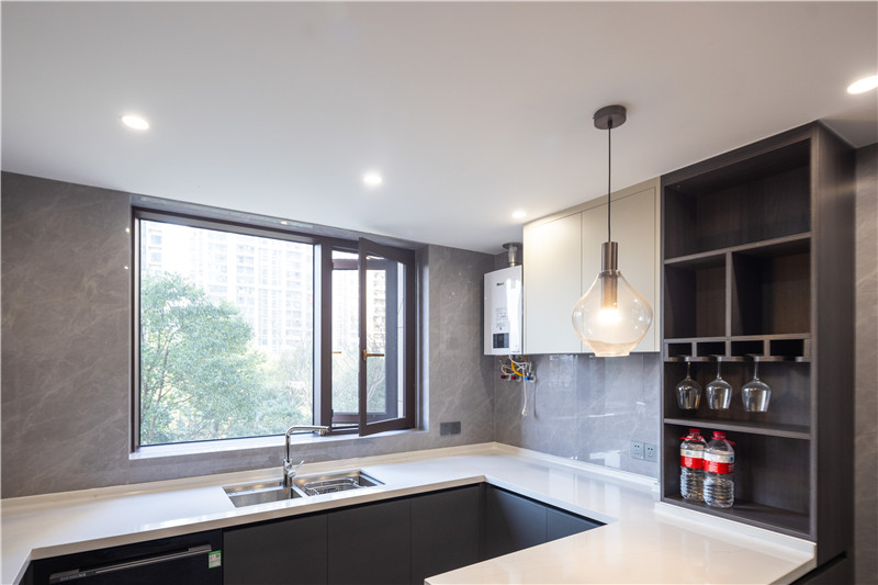 橱柜为水洗灰门板,内嵌烤箱等电器,节约空间;台面岩板耐刮防渗水,台下盆设计更方便打理;洗切烹盛动线,优化空间。