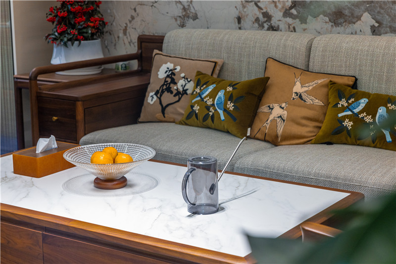 客厅采用中式围合式构造,茶几、沙发、椅子为配套木材,方寸间的沉淀衬中式风骨;沙发背景墙采用整面大理石纹板,亮光属性呼应辅助灯光,增加空间通透感。