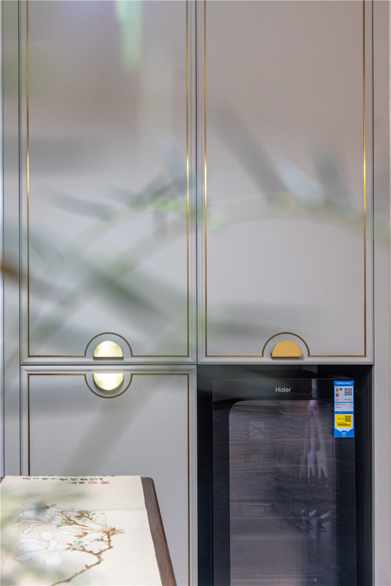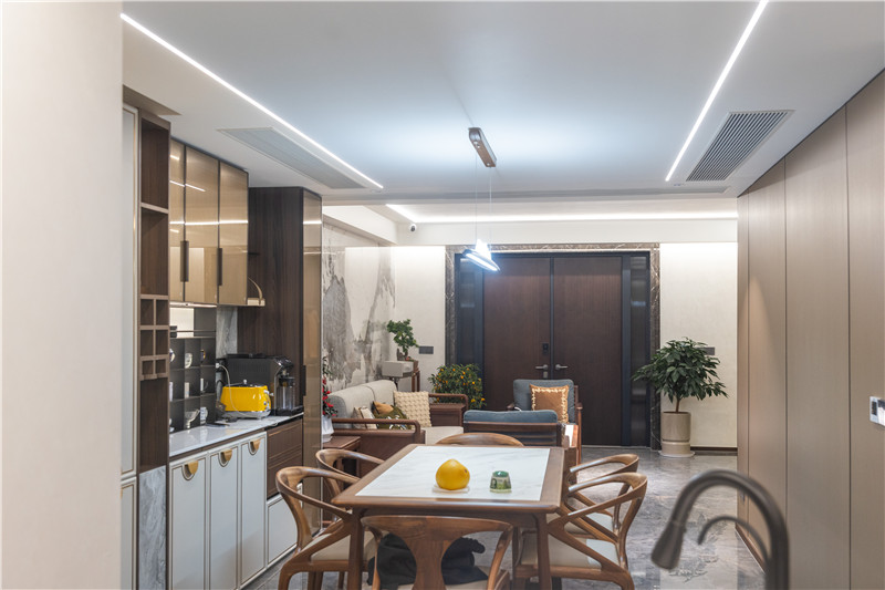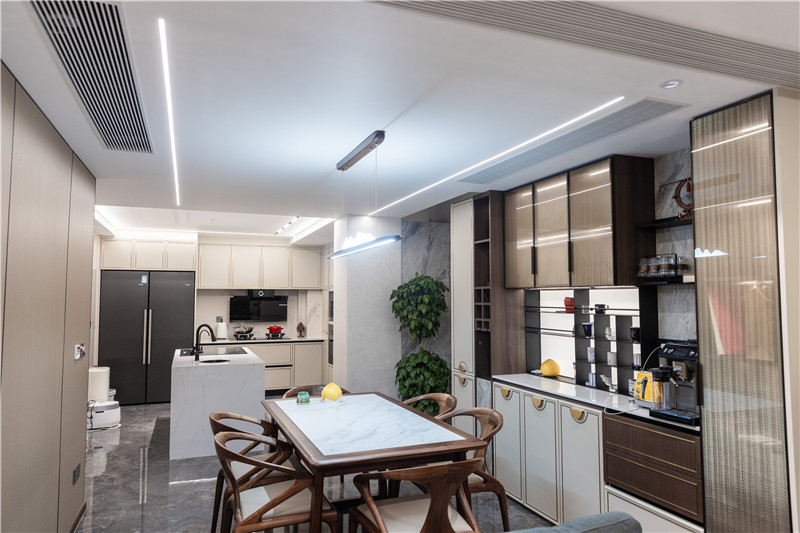 餐厨空间整体为开放式构造,烹饪与用餐动线明晰,方便家庭成员共同参与其中;餐厨空间协调于整屋新中式装修,主灯与辅灯结合式设计,空间敞亮。