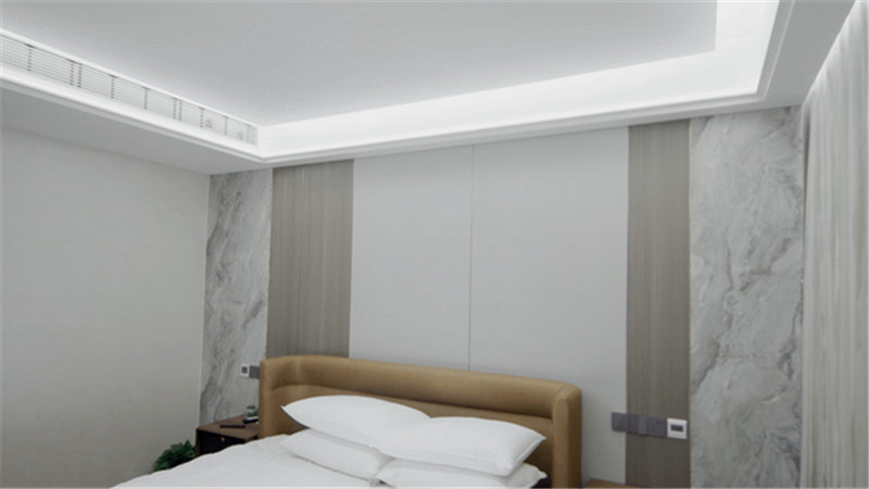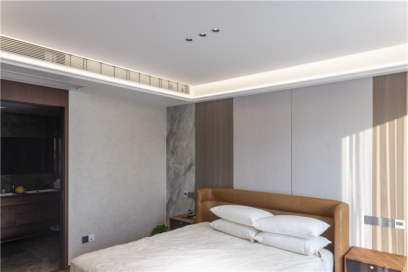 次卧床头背景墙横向拼接,拼接处嵌入条带灯光,配合以艺术床头灯,满满氛围感;侧边立柜增强空间存储力,侧边掏空装饰,整体装修展示性强。