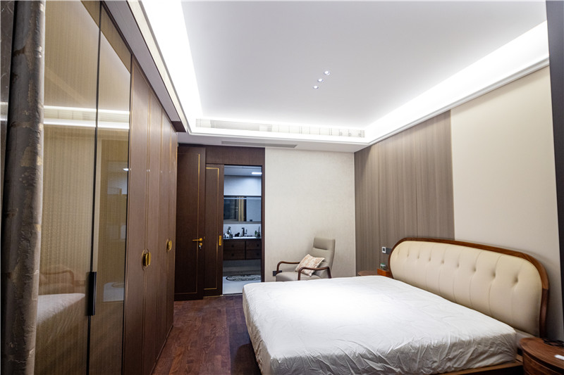 对侧卧室中式风里带有古典气韵,通过合理布局床、床头柜、衣柜来有效利用空间。