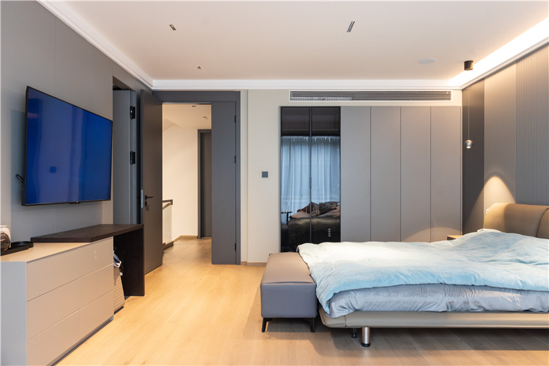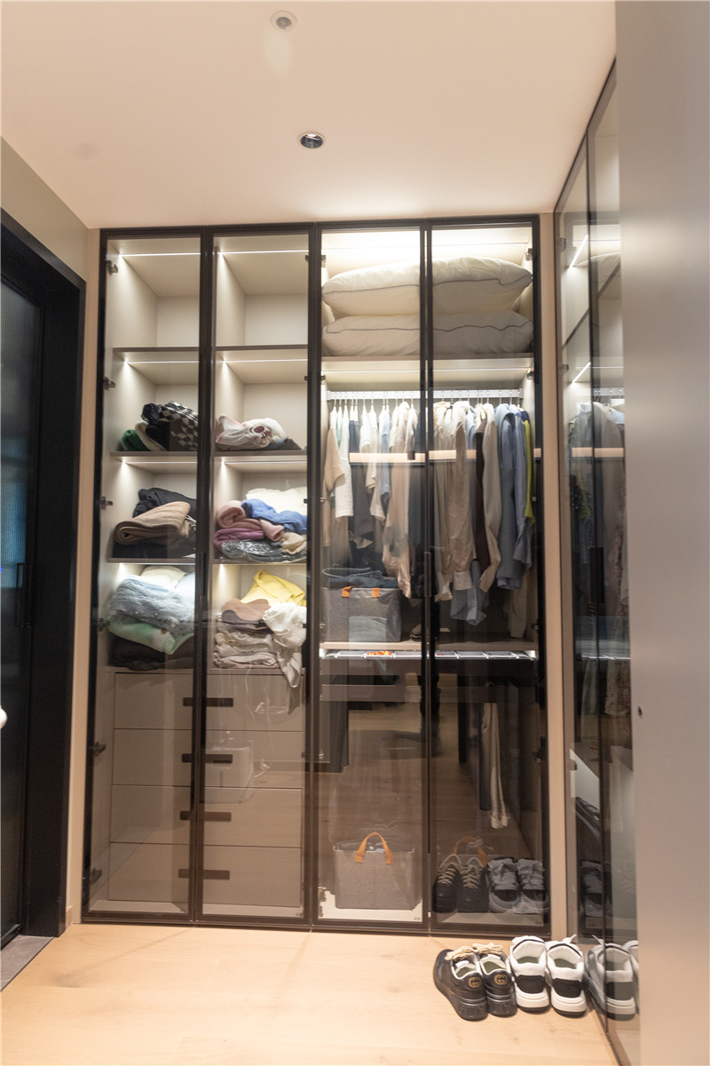 衣柜采用一柜到顶式设计,免去顶部打扫并增强收纳能力。衣柜设计黑玻柜门增加轻奢感,并减缓大面积柜体带来的沉闷。