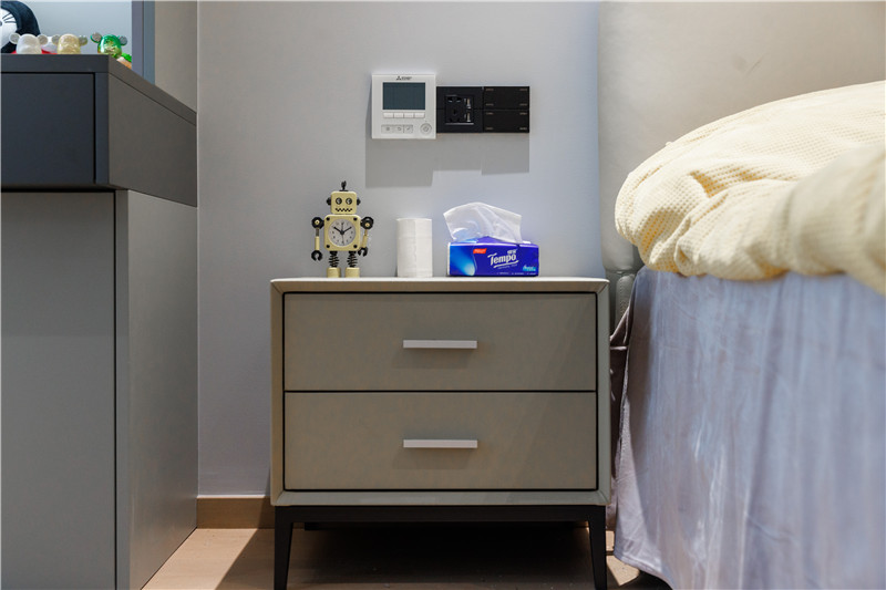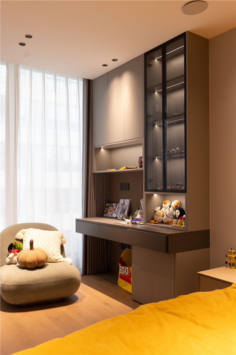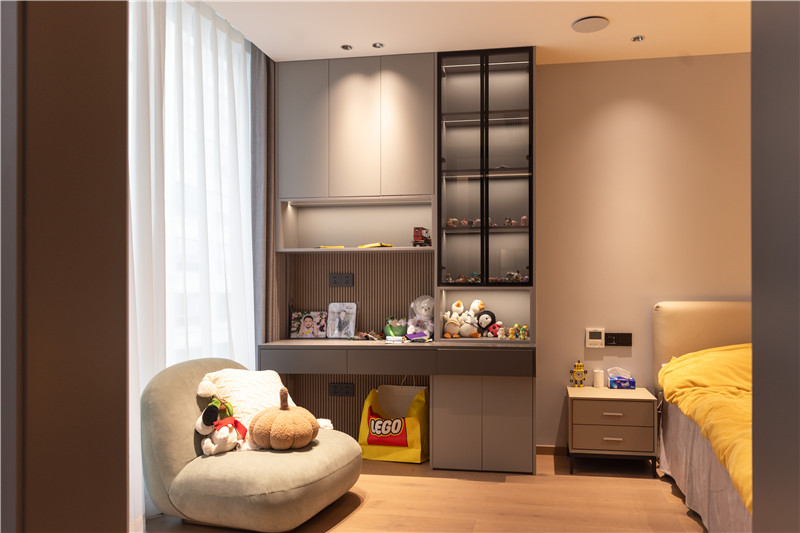 该卧室设计中部不规则开放柜,放置日常玩偶、手办、模型等收藏品,符合使用者所需,同时为衣柜增加了精致与颜值。