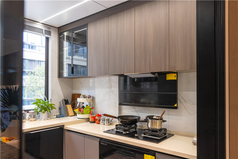 厨房主要以实用功能为主,将空间利用至理想化。U型布局拥有强大的收纳储物能力,将大型厨电内嵌置橱柜中,减轻客厅收纳压力,做饭也变得更便利。
