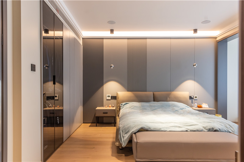 卧室设计整体风格温馨舒适,空间色系更加温和;无主灯设计使得屋内简约开阔;床头背景墙拼接+格栅,时尚又充满设计感。