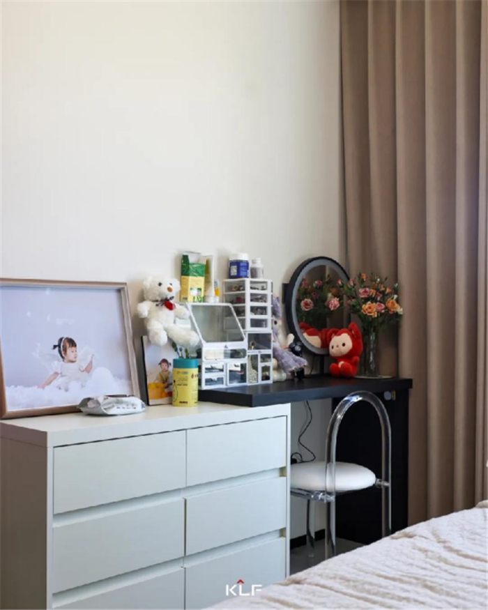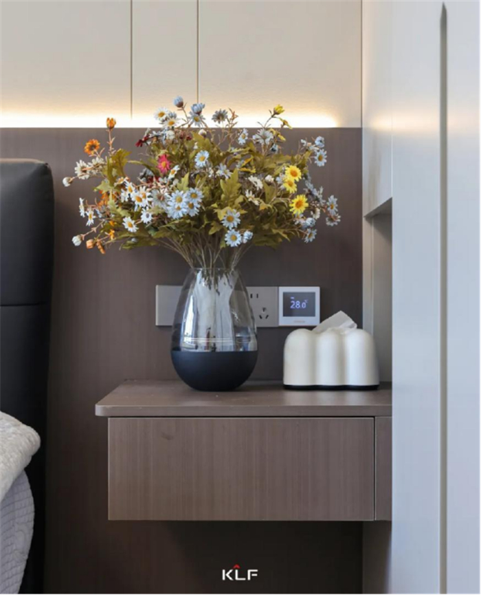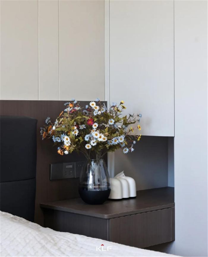 为了避免床尾满墙柜带来的压抑,床尾巧妙设计了梳妆台斗柜,简洁实用。悬挑设计带来轻盈的呼吸感,彰显精致优雅的生活仪式感。