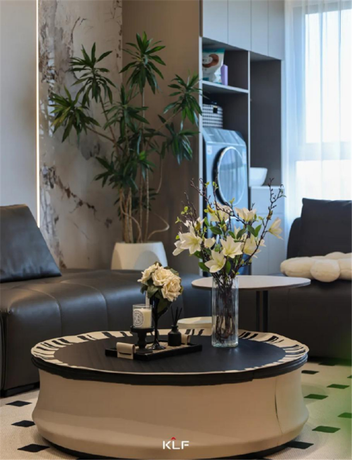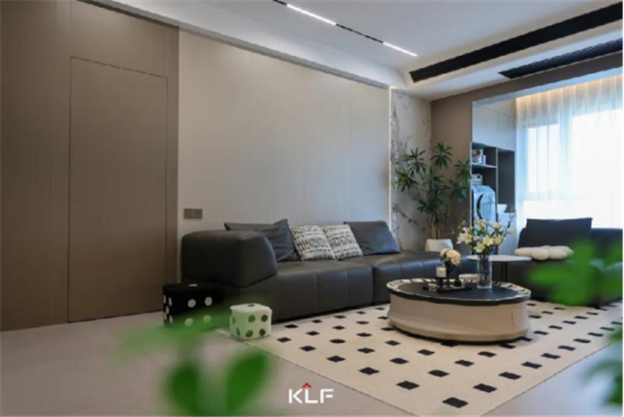 客厅以黑白灰棕为主题配色,沉稳大气,深浅搭配、明暗呼应是层次感和格调的秘诀,深度还原了意式暖咖轻奢风格的简约奢华、舒适典雅。
