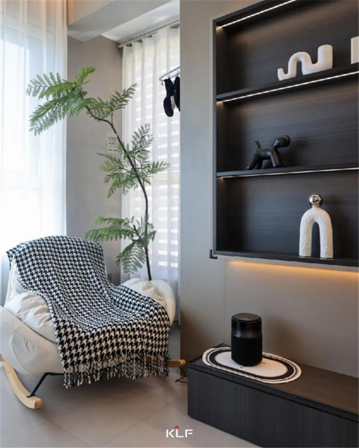 简约线条勾勒天花,稳重色块占据墙地。素雅米白、深邃黑色与质朴木色交融碰撞,朴实温厚的气息浸润空间。