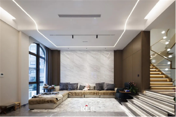 满墙格栅设计增加舒适感,缓和轻奢风带来的疏离,让空间更加和谐宜居,客厅无主灯设计让空间更加宽阔明亮。
