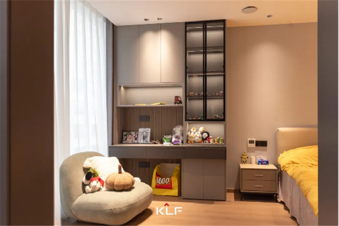 卧室设计中部不规则开放柜,放置日常玩偶、手办、模型等收藏品,符合使用者所需,同时为衣柜增加了精致与颜值。