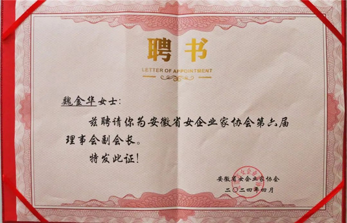 经过筛查与素质的综合评定,米兰智能科技股份有限公司总裁魏金华被聘请为安徽省女企业家协会第六届副会长,体现了协会对魏金华女士工作的认可,这不仅是一份荣誉,更是一份激励。