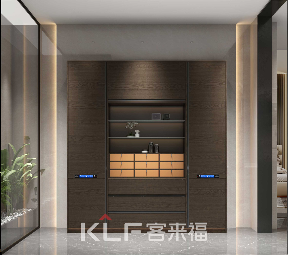 入户空间门板采大面积积横纹门板,在宣示米兰产品高工艺的时候又不失设计感,旁边的开放格用简单的金属框架加以装饰,让其更加高端大气。