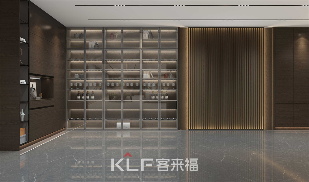 酒柜采用全玻璃门设计,加上柜体内的灯光,让整个酒柜内的装饰一目了然,增强了空间的装饰感。
