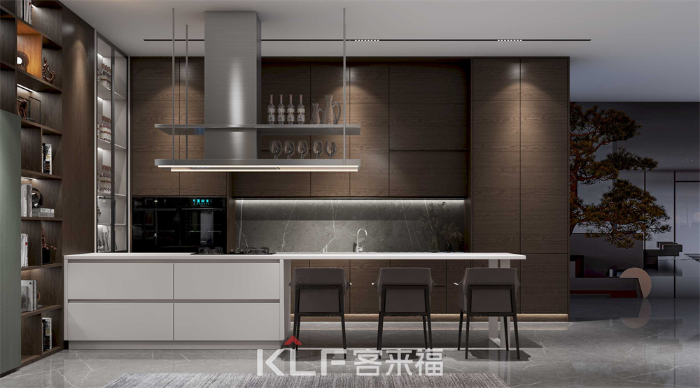 餐厅区域采用一字型橱柜和导台相结合,深色和浅色想搭配的设计,让厨房更显活跃,依靠新材料、新的科技元素加上光与影的⽆穷变化,追求无常规的空间解构,大胆运用对比鲜明的色彩,以及搭配刚柔并济的选材,这便是现代极简风格厨房。