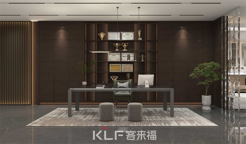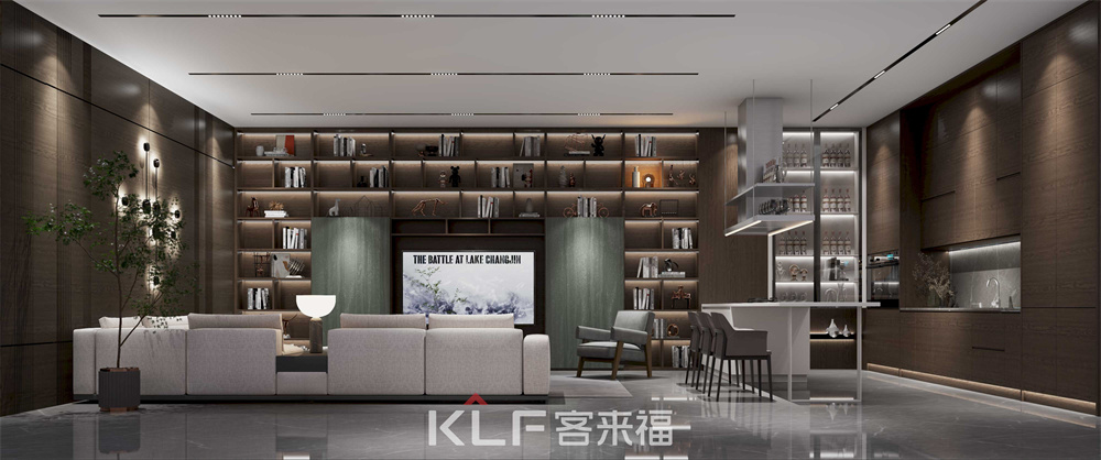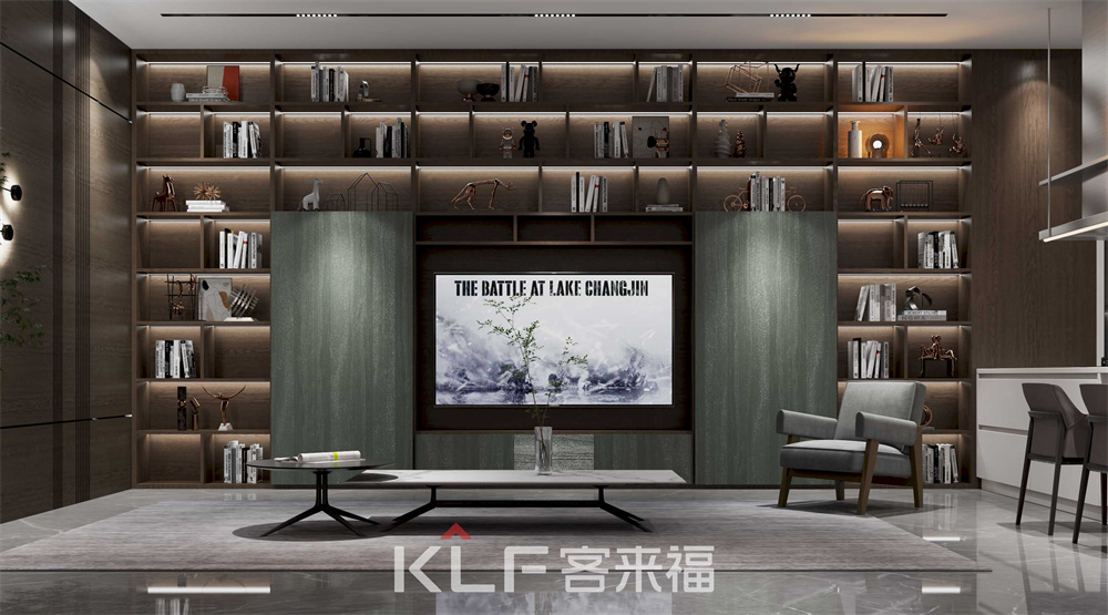 这个区域整体采用咖橡横纹的工艺制作,整体突出大方简单,书柜中间做了简单的板式设计,不仅能让书柜充满设计感,也在结构上起到了支撑超长层板的作用,使其不易变形!