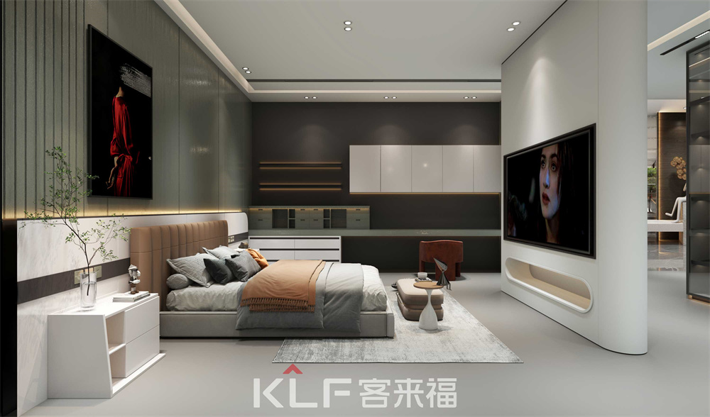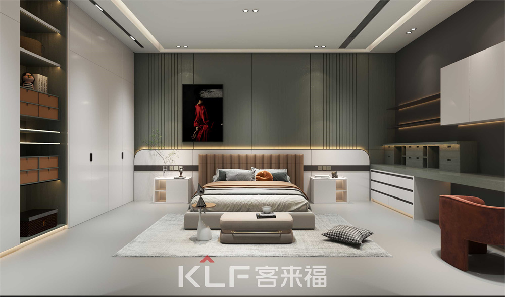 豪嘉系列卧室背景墙采用的是水光绿颜色,床头背板月牙白颜色,两边的衣柜和吊柜柜体采用的是黑木纹柜体,加上月牙白的门板,让人一进卧室就能感觉卧室的温馨和舒适。