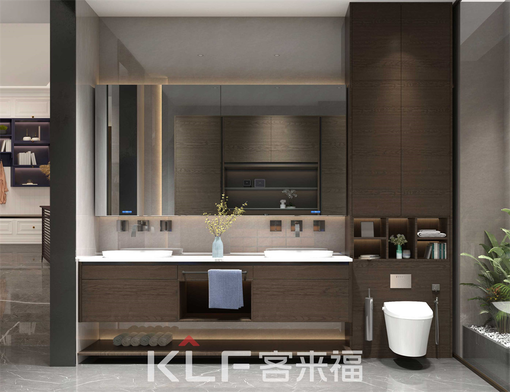 浴室空间,采用横纹的橡木颜色门板,与整个系列的门板横纹相呼应,悬挂的深色浴室柜加上镜柜的搭配,以浅灰色的瓷砖为辅助,更显成熟的大人味风格。