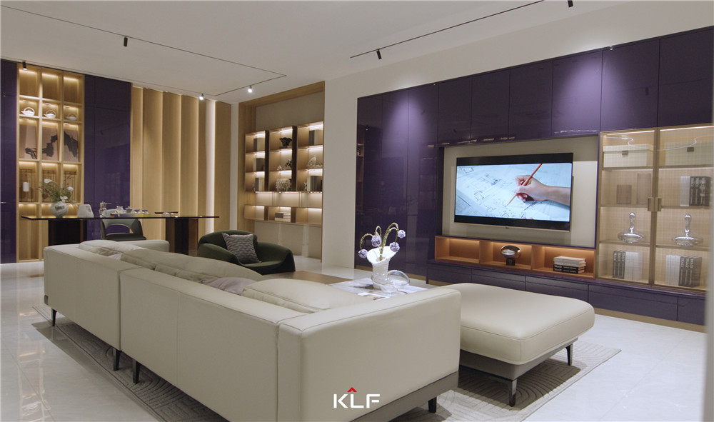 客厅采用围合式布局,一侧墙壁做镜面处理,与柜体进行模块化组合;矩阵成型的柜体紫棠色映入眼帘,活泼且高级;烤漆门板顺滑且颇赋光泽感,展现出米兰的创意工艺。