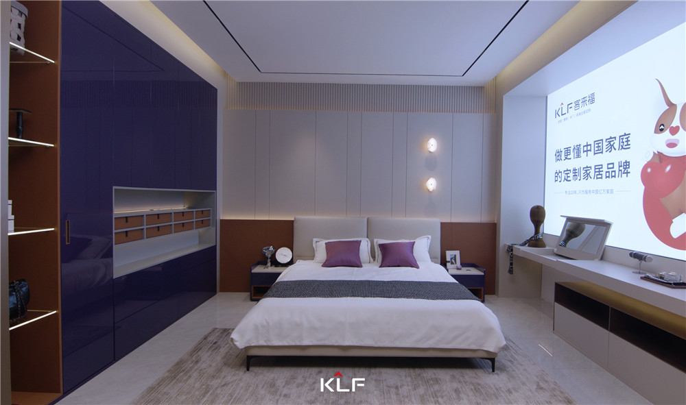 主卧从材质上进行升级,床头护墙板采用茶白色+浅可可色+爱马仕橙的组合配色,设计感在线;在紫棠色衣柜上,米兰加入了皮革元素,衬托出空间的品质感。