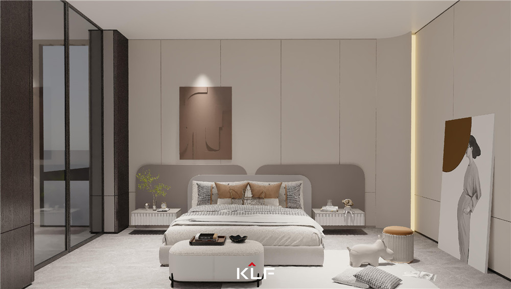 卧室空间摒弃传统木门分隔空间的设计,以360度旋转中轴门分割共同与私密空间;床头背景板皮革全包,更显家居质感;圆柱形床头柜形体新颖,床尾凳舒缓物品放置压力,满满的设计智慧。